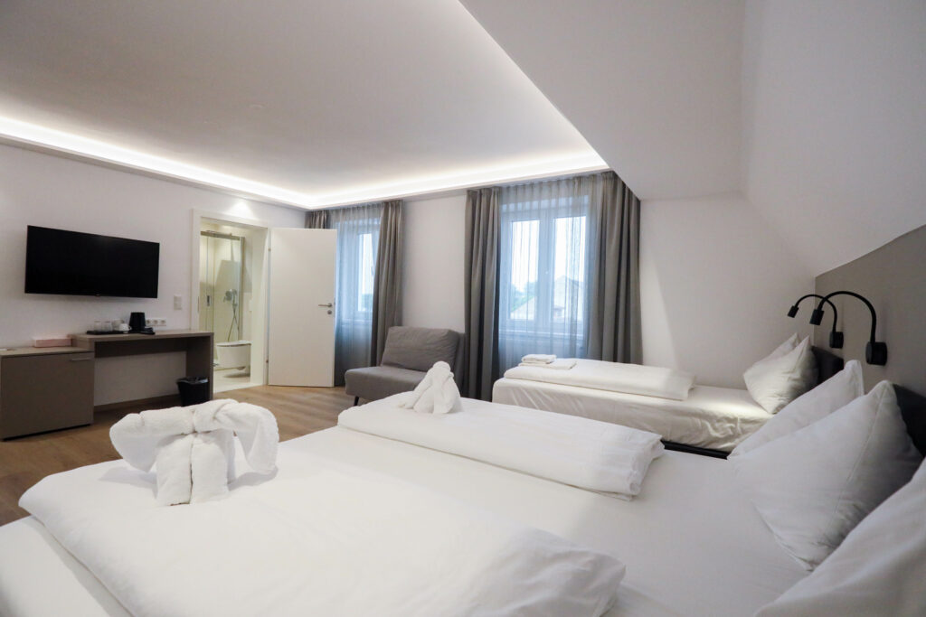 Finden Sie Entspannung und Ruhe in unseren großzügigen Dreibettzimmern, ideal für Familien oder kleine Gruppen. Jedes Zimmer ist sorgfältig gestaltet, um Ihnen nach einem erlebnisreichen Tag in Krems den perfekten Raum zur Erholung zu bieten.